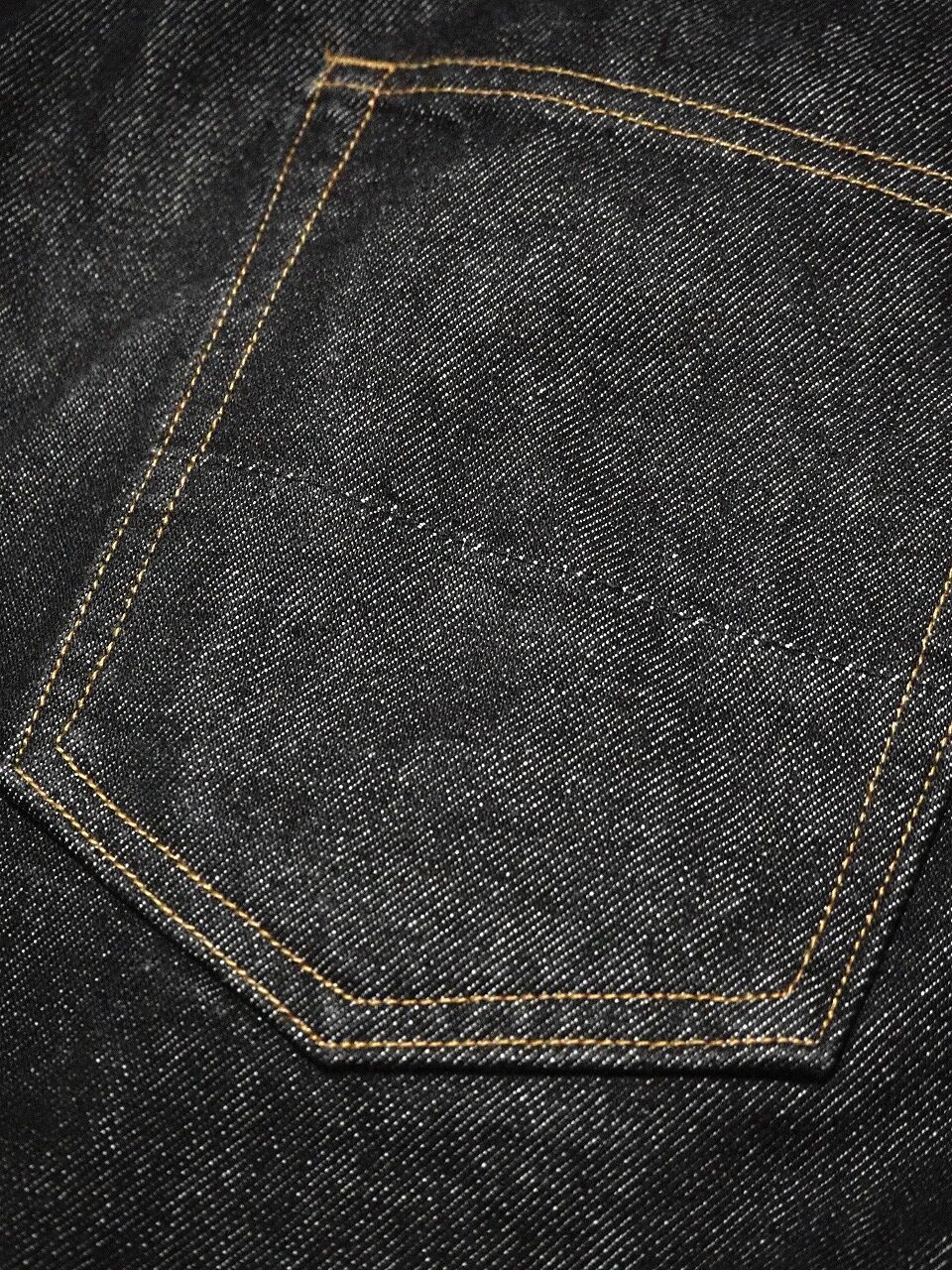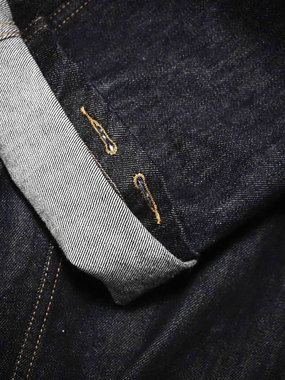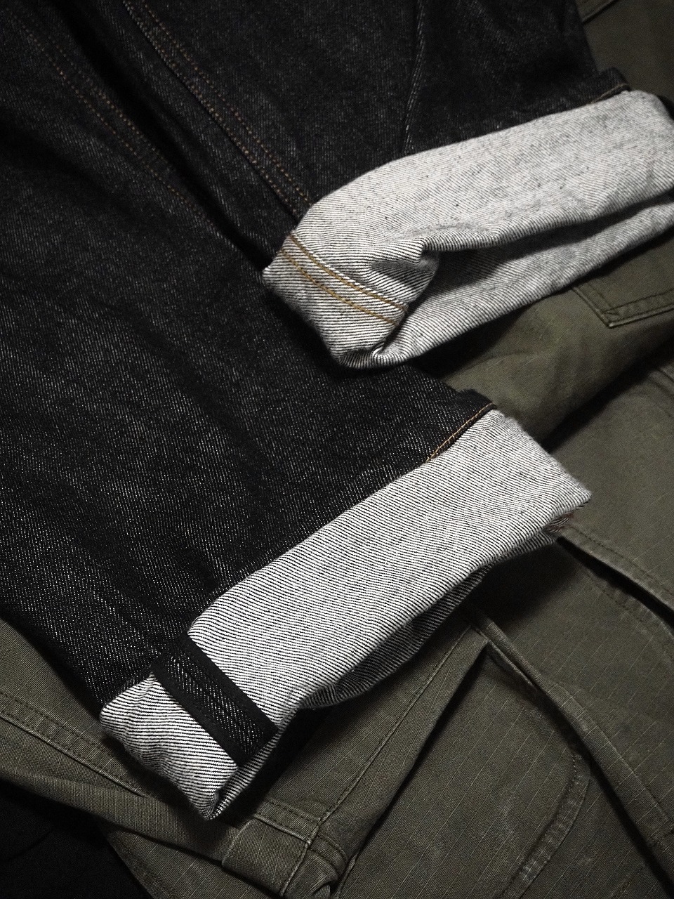 通常よりも太さのあるシルエットに、オリーブのバックサテンではなく、インディゴデニム。