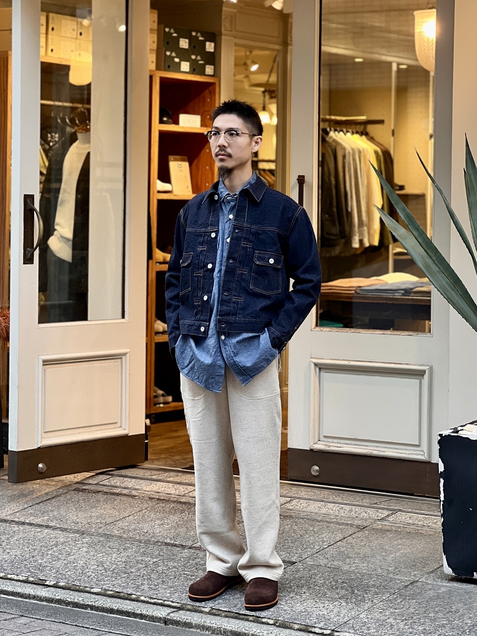 デニムジャケットとシャンブレーシャツで合わせたアメカジテイストのスタイリング。