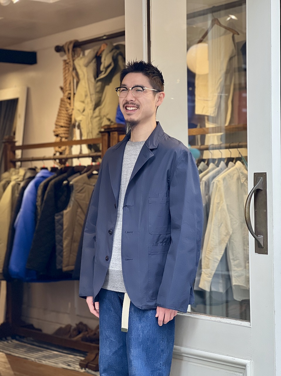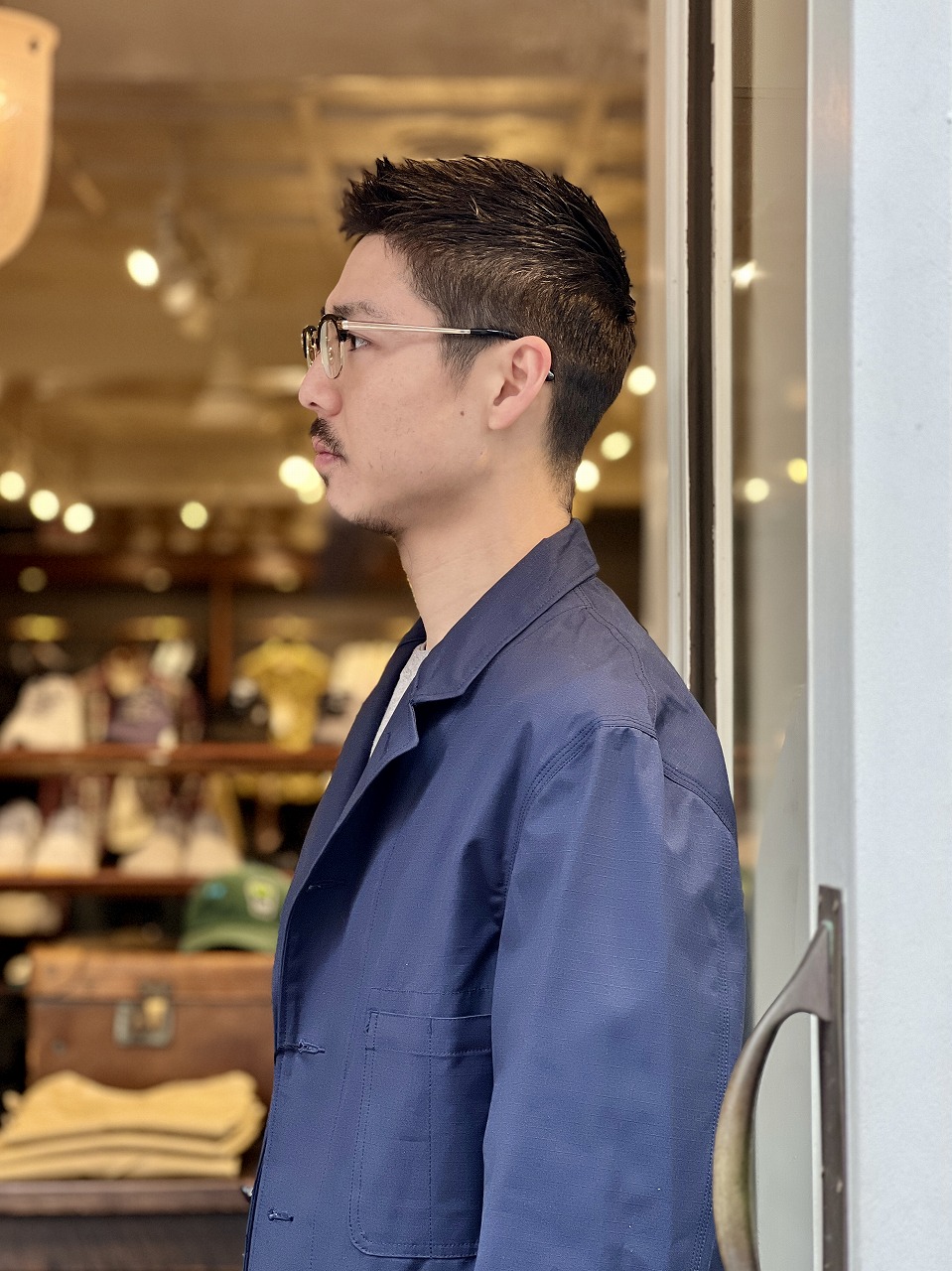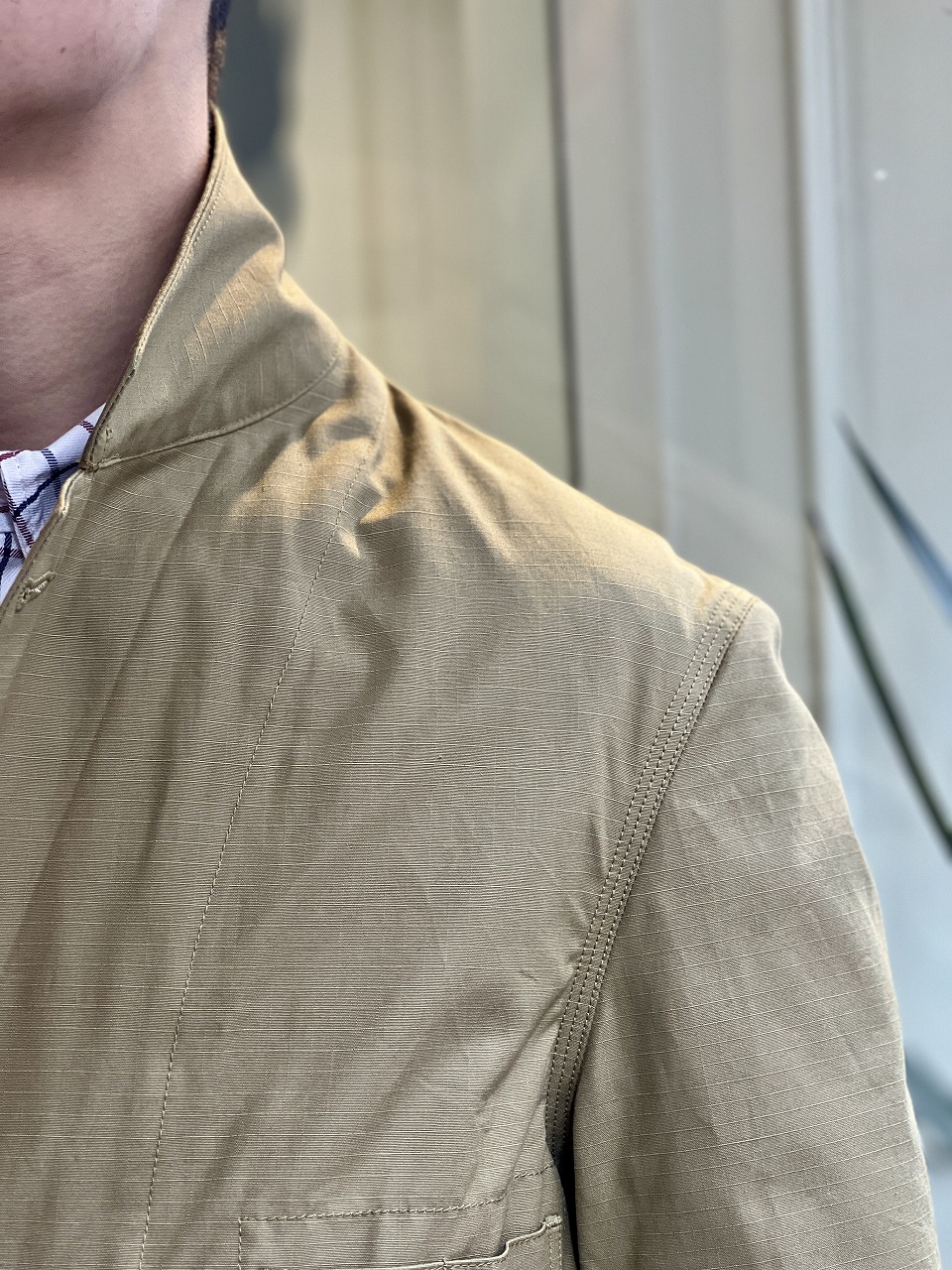 ラペル付きのジャケットながらもシガーポケット、トリプルステッチ、リップストップ生地など、どことなくワークな印象。
